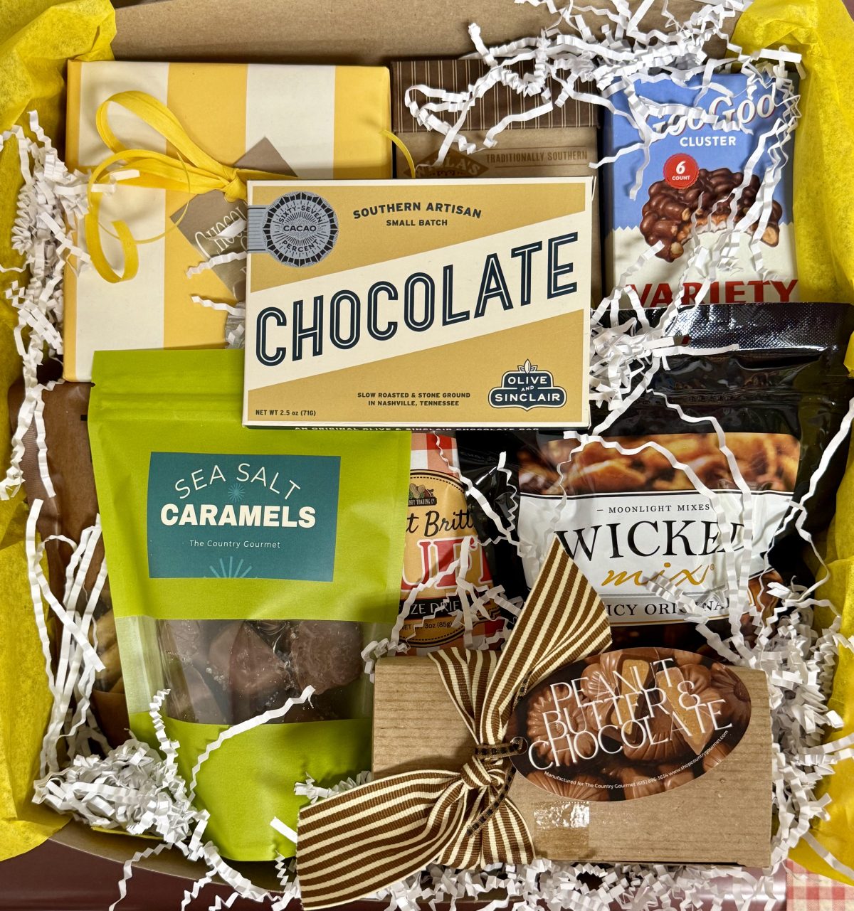 Contains: Sea Salt Caramels, Puffed Peanut Brittle, Chocolate Covered Potato Chips, Willa’s Shortbread Cookies, Milk Chocolate Peanut Butter Bites, Wicked Snack Mix, 6 Count Goo-Goo Variety Pack, Olive & Sinclair Chocolate Bar, Tennessee Hot Crackers